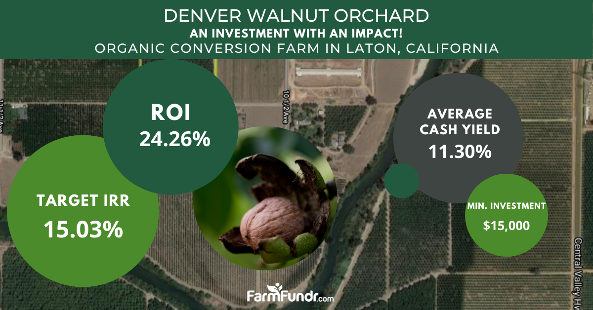 As explained, organic farming and certification is not possible or the right choice in some situations. However, sometimes it is! This is the case for the latest opportunity available to FarmFundr's investors. Denver walnut orchard is a high production farm, perfectly positioned in the fertile Central Valley of California, with excellent water access. After conducting due diligence, it was determined that this orchard is well suited to convert to Certified Organic. FarmFundr believes that this conversion will have a positive financial and environmental impact.